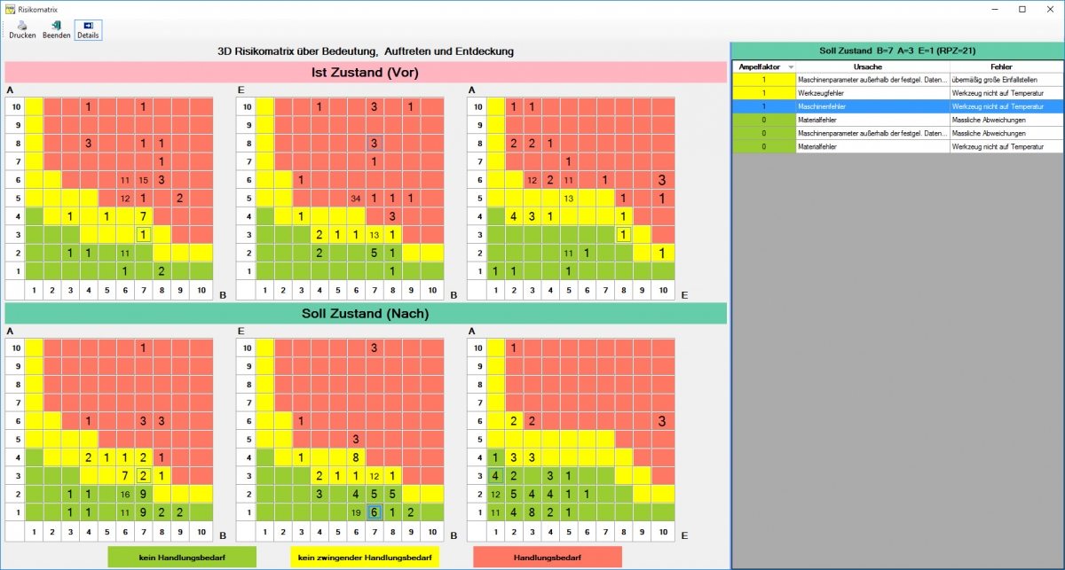 In der gut strukturierten Übersicht werden die Verbindungen zwischen Fehlern, Fehlerursachen, Fehlerfolgen und Maßnahmen hergestellt und visualisiert. Die Anzeige entspricht der späteren Darstellung im FMEA-Formular. Die Risikobeurteilung (B, A, E) und die daraus resultierende Berechnung und Überwachung der RPZ ist hier direkt integriert. Die Elemente mit den größten Risiken sind automatisch nach oben geführt und deutlich kenntlich gemacht. In Verbindung mit SWM werden die Risiken direkt im Prozessbaum und im grafischen Workflow visualisiert.