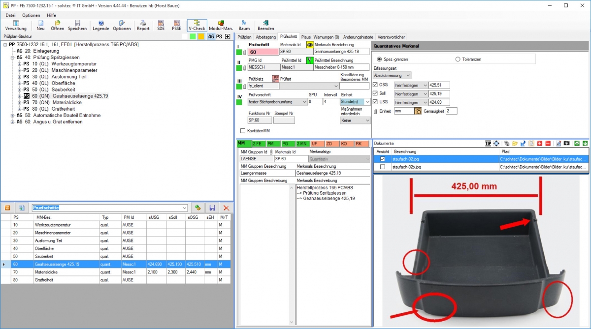Die Verknüpfung von Dokumenten ist auf allen Ebenen möglich. Zum Prüfplan, Arbeitsgang bis hin zu jedem Prüfschritt können beliebig viele Dokumente mitgegeben werden. Mit Hilfe der in solvtec-CAQ integrierten Funktion zur Lenkung der Dokumente bis an den Prüfplatz erhalten alle am Prozess beteiligten Personen sicher die aktuellsten Dokumente und Bilder zugestellt.